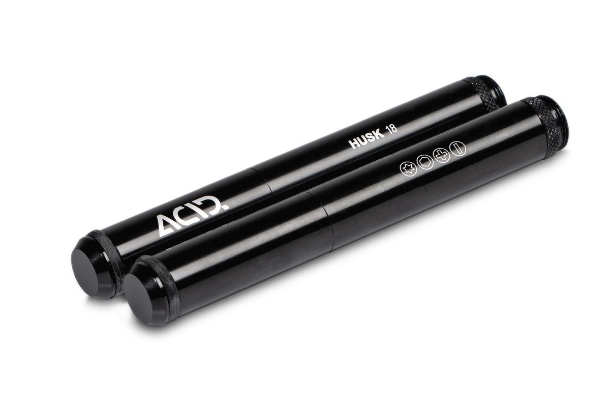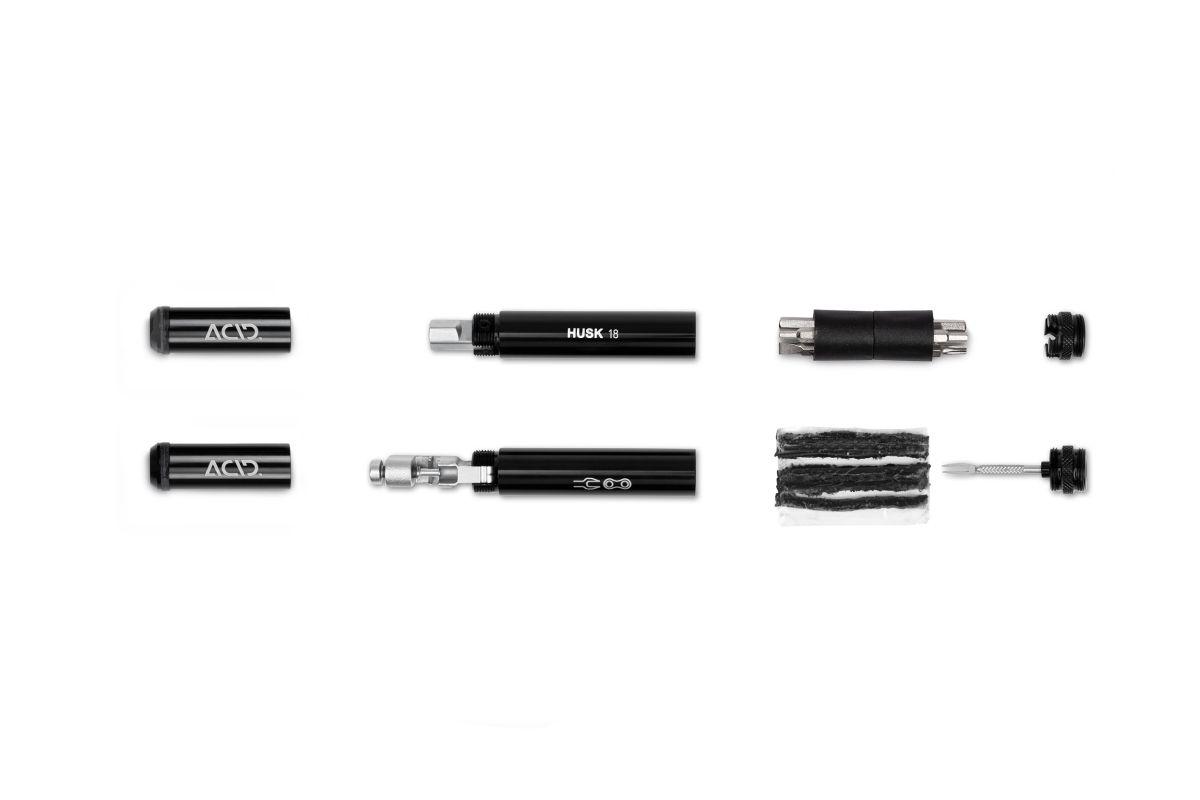 Ein hochwertiger Werkzeugkoffer auf kleinstem Raum und in coolem Design – das ist das ACID Multitool HUSK 18. Die zwei Metall-Tubes liegen perfekt in der Hand. Im Inneren finden 18 Funktionen Platz – gut geschützt vor Schmutz. Der Kettennieter und die BIT-Aufnahmen sind für bessere Hebelwirkung um 90° klappbar. Die beiden Tubes des HUSK 18 können mit dem ACID GILink für HUSK dezent im Lenker versteckt oder mit den ACID Rahmenhalterungen am Flaschenhalter montiert werden.