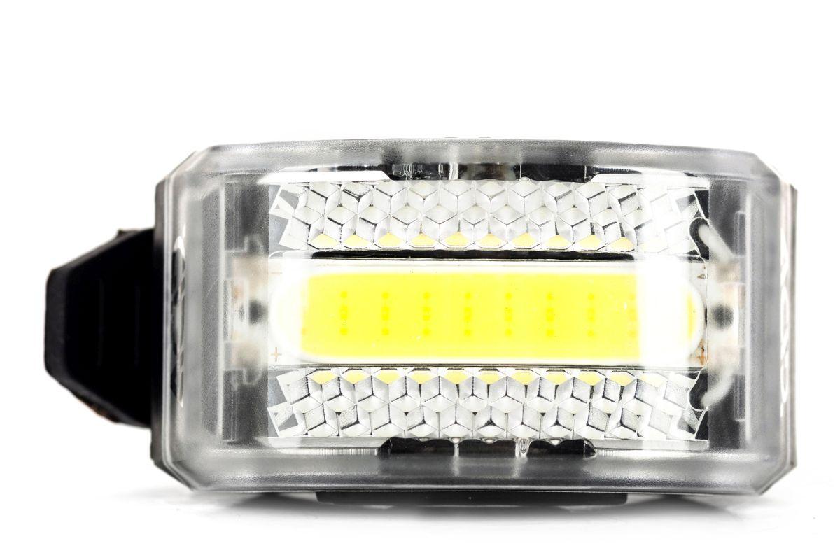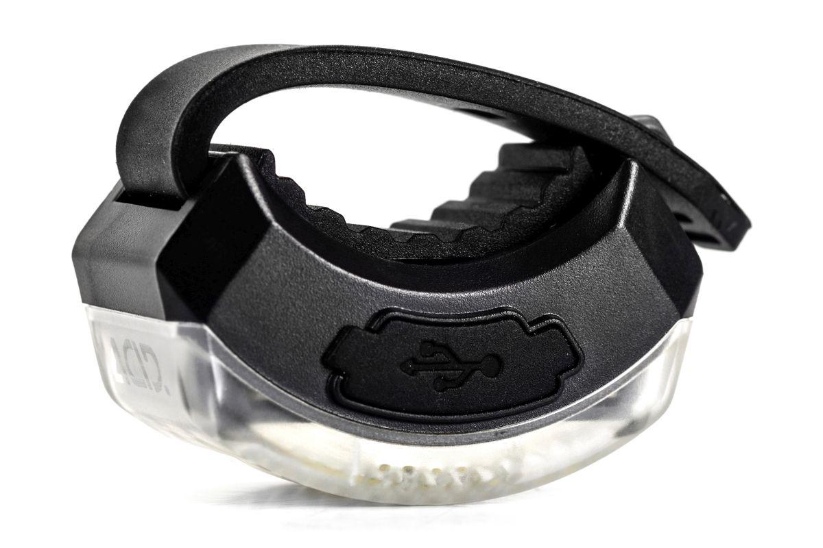 Sicherheitslicht "weiß" mit COB LEDs, 20 Lumen, integrierter Lithium-Polymer-Akku, 5 Lichtfunktionen, 2-stufiger Batterieindikator, spritzwassergeschützt, Silikonbandbefestigung