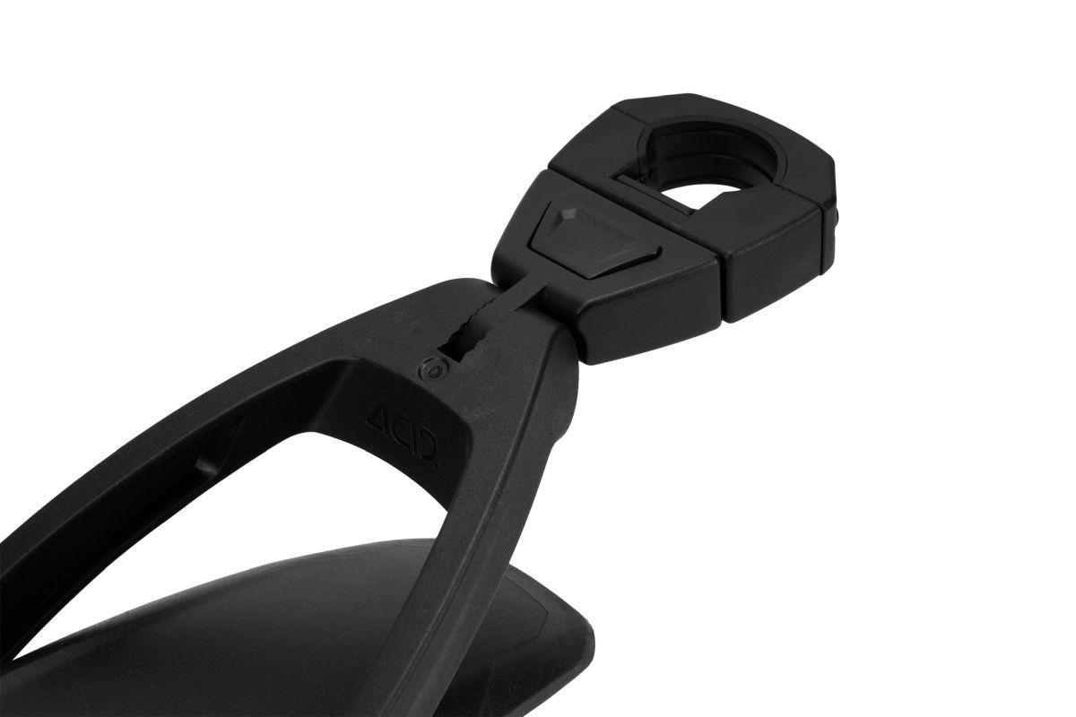 Mit dem cleveren ACID PRO Vane Click Anschluss ermöglichen wir eine sekundenschnelle Montier- und Demontierbarkeit. Nach einmaliger Befestigung eines Klemmadapters an der Sattelstange, kann durch das einfache Betätigen eines Buttons das Schutzblech entriegelt und wieder verbunden werden und ermöglicht dem Fahrer eine flexible Einsetzbarkeit.