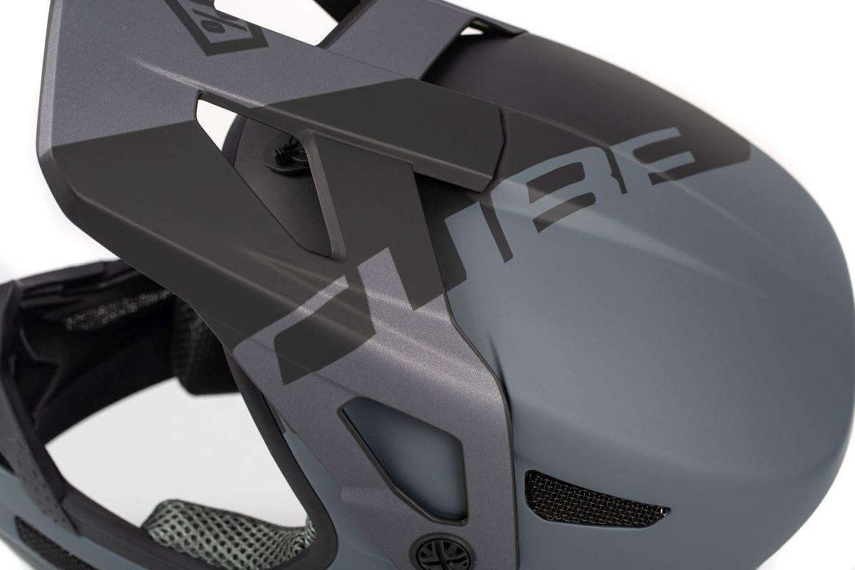 DH/MTB-Helm, Kollaboration mit 100% Speed Lab, ultraleichte Fiberglasschale, aktives Kühlungssystem, optimierte Ventilationskanäle, herausnehmbare und waschbare Polster, perfekte Passform, höhenverstellbares Visier, Kinnbügel innseitig PU gepolstert, kompatibel mit aufblasbarem Helmnotfallsystem, CUBE Design, mattes Finish