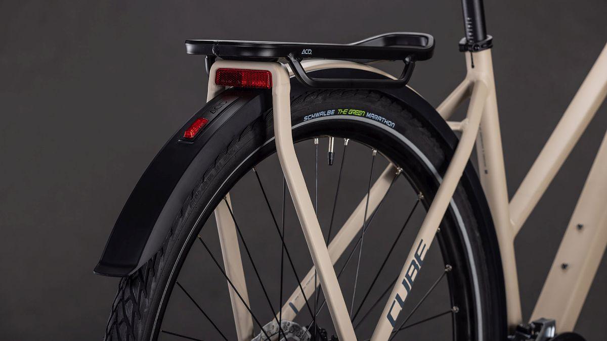 Aufsitzen, antreten und die Tour genießen: Mit dem schlichten Kathmandu ONE von CUBE bekommen Entdecker einen robusten und flexibel anpassbaren Alleskönner unter den Sattel. Auf dem stabilen, vielseitigen integrierten Gepäckträger IC 3.0 findet alles Platz, was unterwegs mit muss. ACID Schutzbleche, Vorder- und Rücklichter und ein Flat Mount Seitenständer sind auch mit dabei. Dazu hat die einfach bedienbare Cues 2x9-fach Schaltung aus dem Hause Shimano in jeder Situation den passenden Gang im Angebot. Ebenso von Shimano kommen die hydraulischen Scheibenbremsen für sicheres Verzögern und Anhalten bei jedem Wetter. Angenehmer Fahrkomfort, auch auf holprigen Wegen, ist das Spezialgebiet der Suntour Federgabel. Umweltbonus: Die spezielle Gummimischung der Green Marathon Reifen von Schwalbe besteht zum Großteil aus recycelten Altreifen – für nachhaltige Mobilität auf allen Wegen. Da kann's doch direkt losgehen, oder?