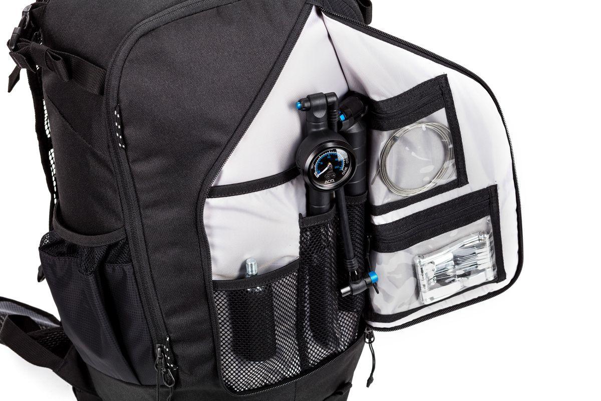 trinkblasenkompatibel, Zippertasche im Hauptfach, Werkzeugfach in der Front Flap, Kompressionsriemen, Helmhalterung, Protektorenhalterung, Rückenprotektor-kompatibel (SAS-Tec SCA 450), Easy-Access Seitenfach für Smartphone/Trailkarte, Hüftgurttaschen, Natural Fit Rückensystem