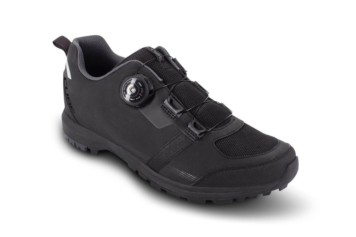 Stylischer All Terrain Schuh mit fortschrittlichem Drehverschluss und toller Passform dank ergonomisch optimierten CUBE Natural Fit Leisten und Innensohle. Clevere Features wie die Einstiegshilfe und der Laceholder machen das Leben leichter, während die griffige Gummi-Außensohle für Klickpedale auch beim Gehen tollen Halt gibt. Das robuste Obermaterial und die verstärkte Zehenkappe schützen den Fuß, dank Luftlöcher und Mesh-Konstruktion bleibt selbiger aber immer angenehm belüftet. Das reflektierende Fersenelement schenkt zusätzliche Sicherheit durch mehr Sichtbarkeit bei schlechten Lichtverhältnissen.