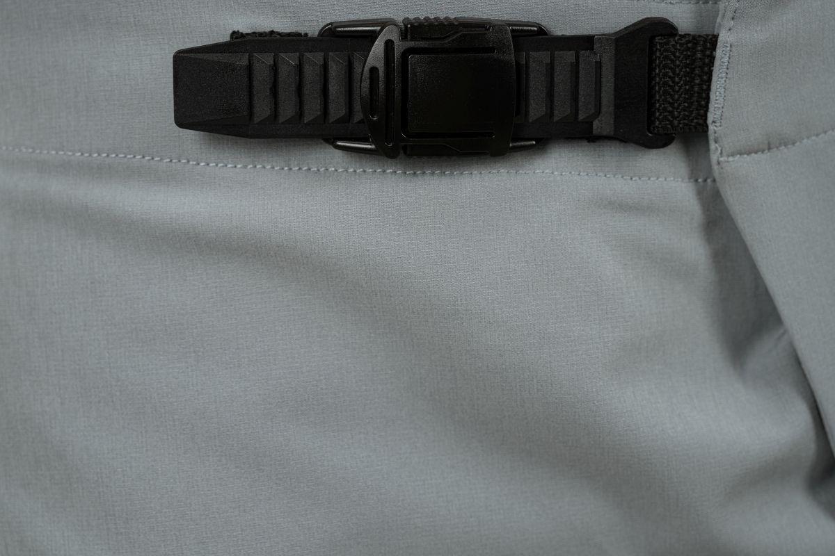 leichtes Material, eine Seitentasche mit Reißverschluss, Ratschenverschluss, Perforation zur Ventilation am Innenbein, Model ist 186 cm groß, Model trägt Größe L