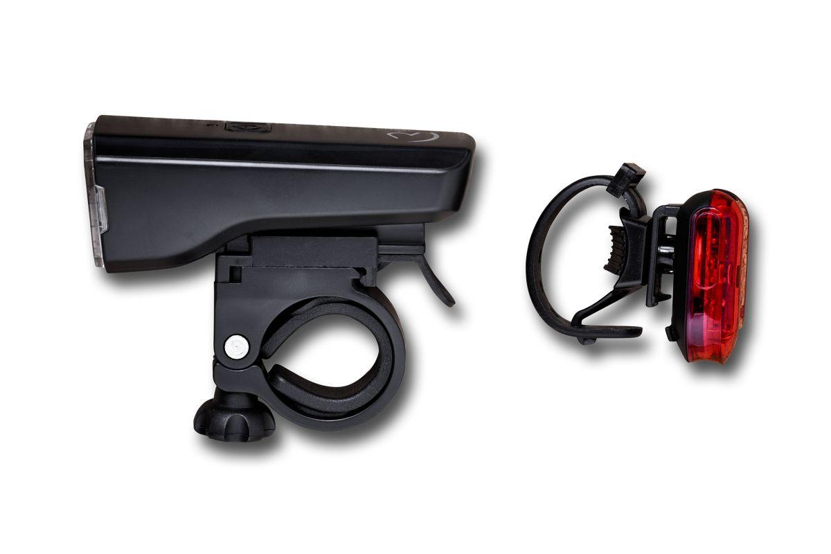 LED-Frontlicht, StVZO zugelassen, 25 Lux, USB aufladbarer, integrierter 850 mAh Lithium-Akku, werkzeuglos montierbar, inkl. USB Kabel, LED-Rücklicht, StVZO zugelassen, 2 in 1 Halterung