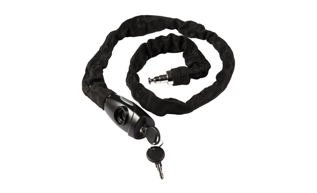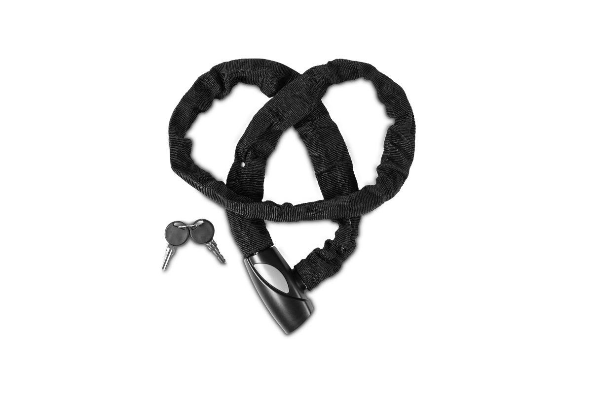 extra sicheres Kettenschloss, Kette und Schlosskörper korrosionsgeschützt, Textilüberzug und Kunststoffcover schützen den Rahmen vor Kratzern, geprüft auf mechanische Festigkeit, abnutzungsresistent, schadstoffarm zertifiziert, inkl. zwei Schlüssel