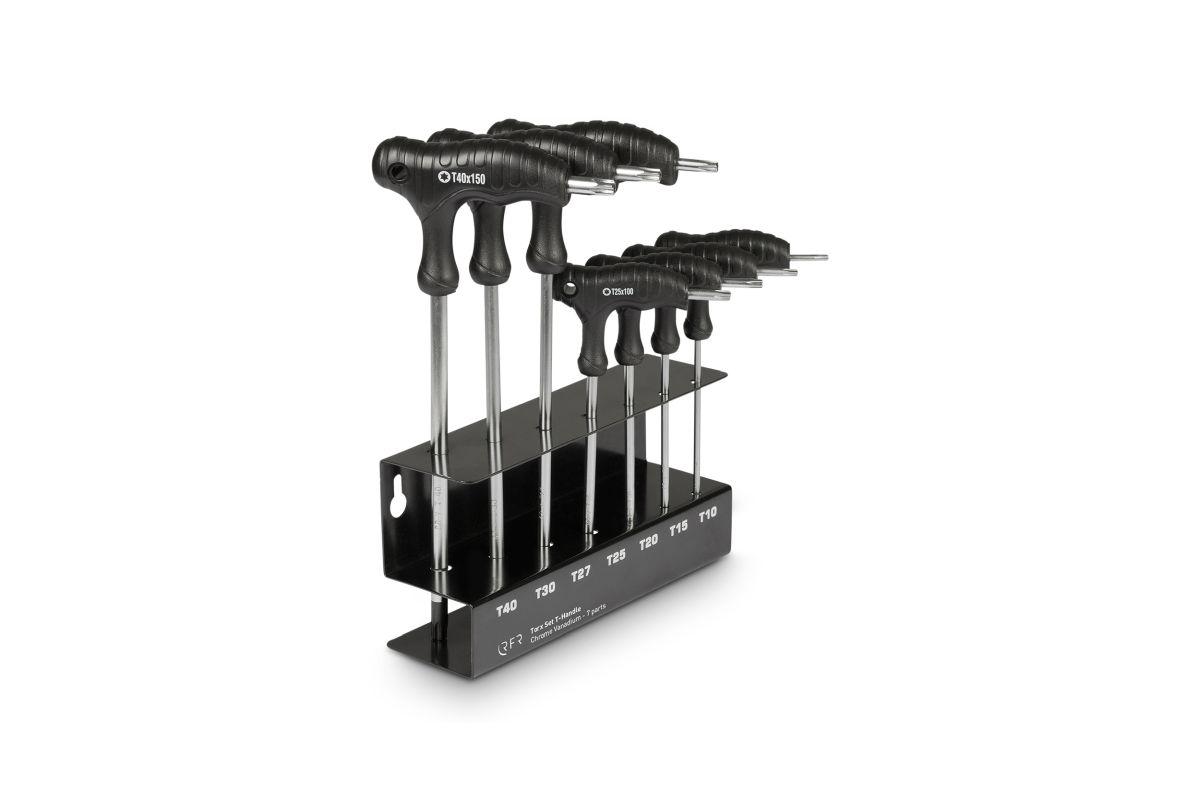 7-teiliges Schlüssel-Set für Rundinnensechskant-Schrauben mit T-förmigem Griff aus Thermoplaste. Beinhaltet T10/ T15/ T20/ T25/ T27/ T30 und T40 Schlüssel.