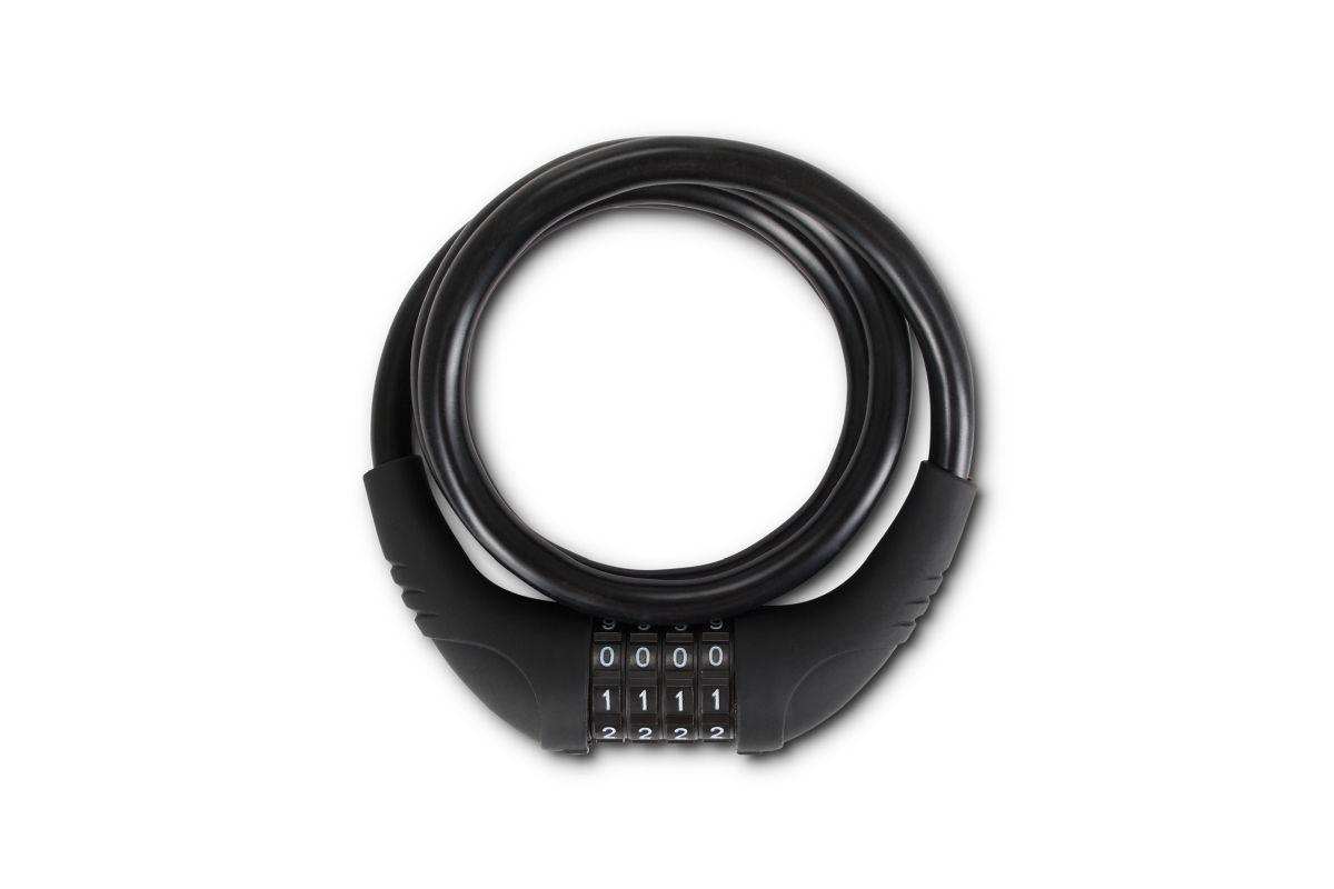 sehr sicheres Kabelschloss, flexible und Silikon ummantelte Oberfläche, Kabel- und Schlosskörper korrosionsgeschützt, geprüft auf mechanische Festigkeit, abnutzungsresistent, schadstoffarm zertifiziert, einfache Handhabung, frei einstellbarer Code