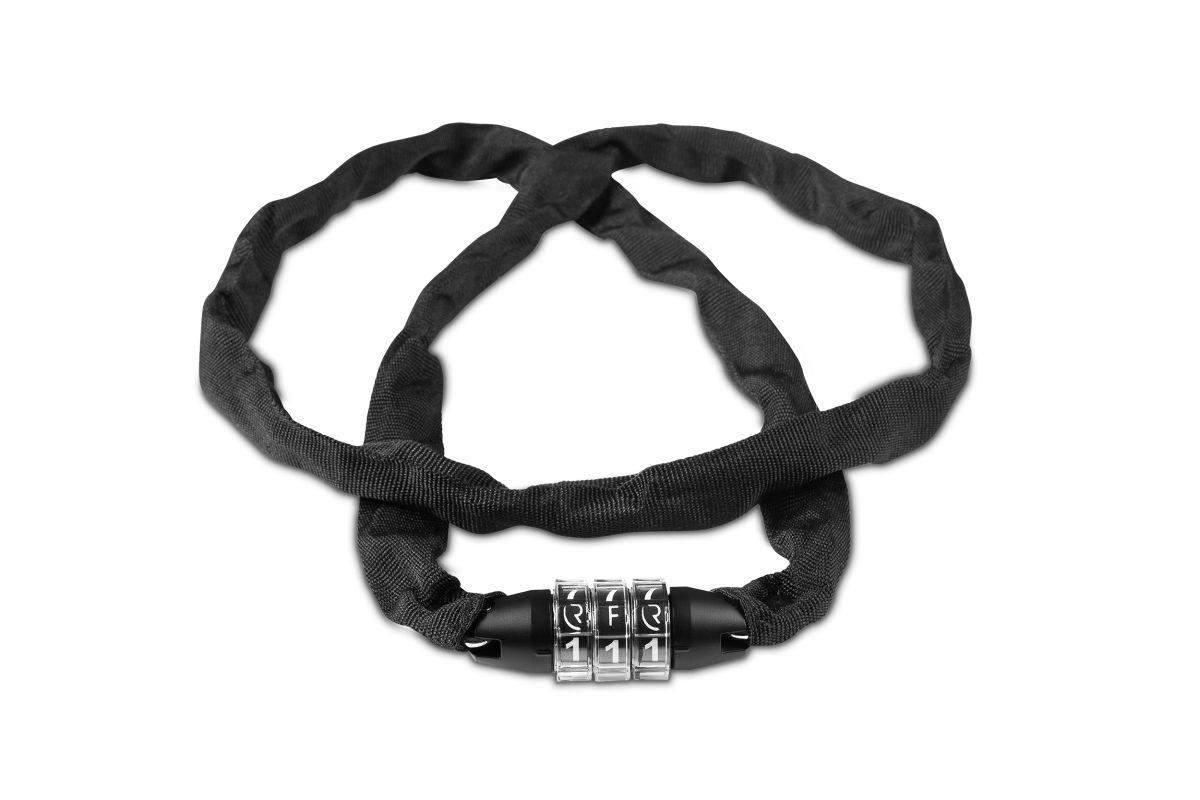 Sehr sicheres Zahlenkettenschloss, Textilüberzug schützt den Rahmen vor Kratzern, Kette und Schlosskörper korrosionsgeschützt, frei einstellbarer Zahlencode, einfache Handhabung