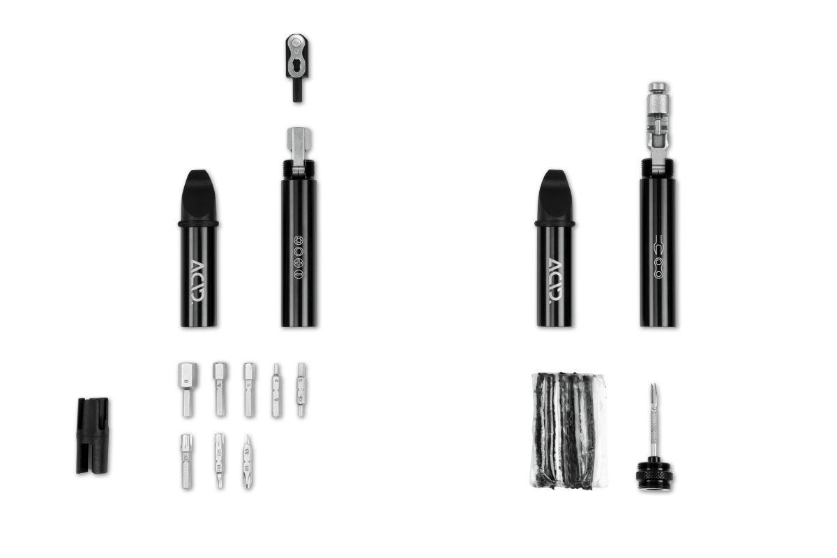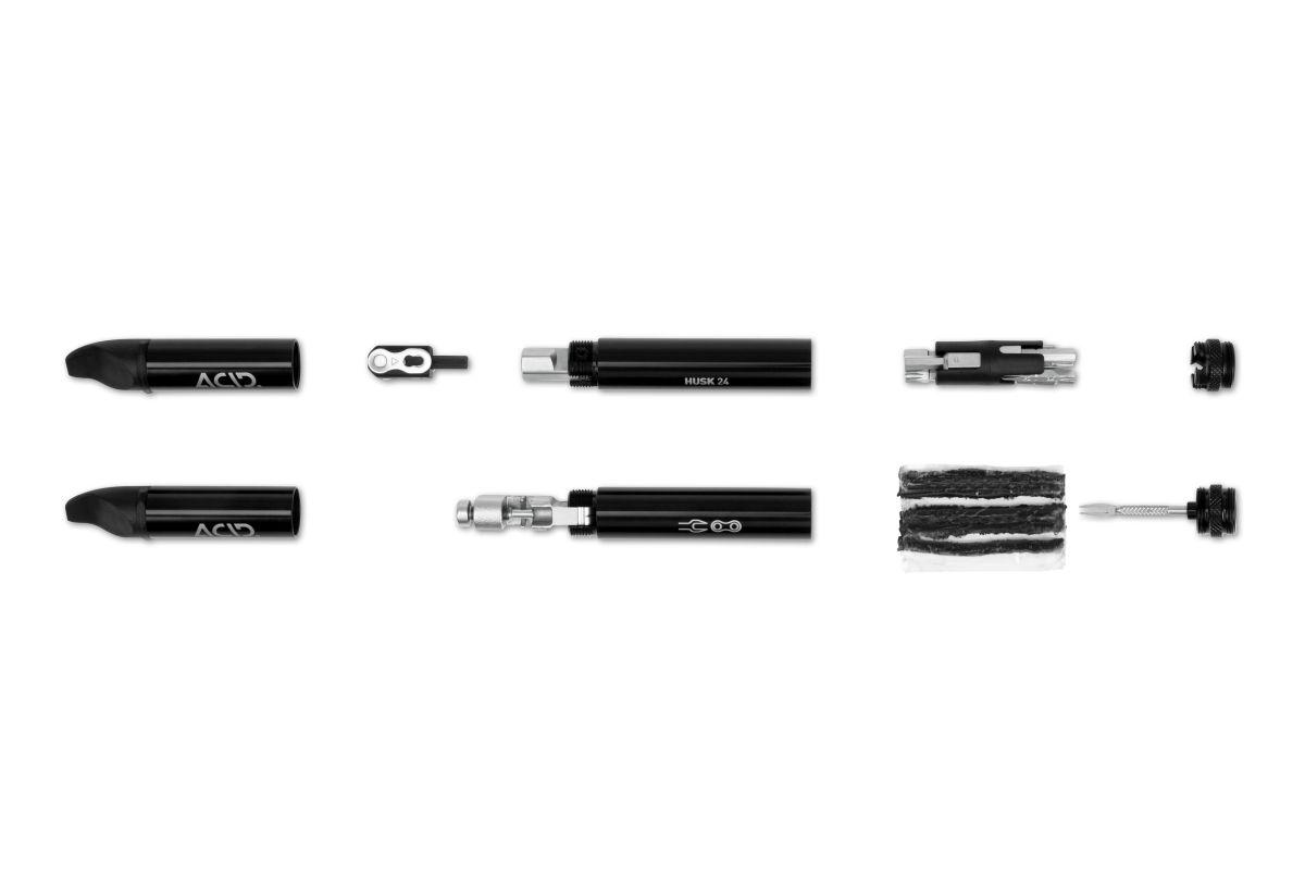 Ein hochwertiger Werkzeugkoffer auf kleinstem Raum und in coolem Design – das ist das ACID Multitool HUSK 24. Die zwei Metall-Tubes mit Reifenhebern an jeweils einem Ende liegen perfekt in der Hand. Im Inneren finden 23 weitere Funktionen Platz – gut geschützt vor Schmutz. Der Kettennieter und die BIT-Aufnahmen sind für bessere Hebelwirkung um 90° klappbar. Die beiden Tubes des HUSK 24 können mit dem ACID GILink für HUSK dezent im Lenker versteckt oder mit den ACID Rahmenhalterungen am Flaschenhalter montiert werden.