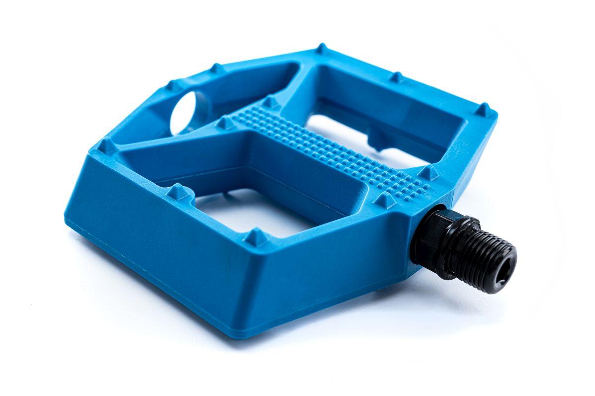 leichtes Flat-Pedal, Nylon-verstärkter-Kunststoff-Körper und CrMo Achse, angefaste Kanten für erhöhte Bodenfreiheit in Kurven, große Standfläche, flache Bauweise, zwölf Pins pro Seite, kugelgelagert