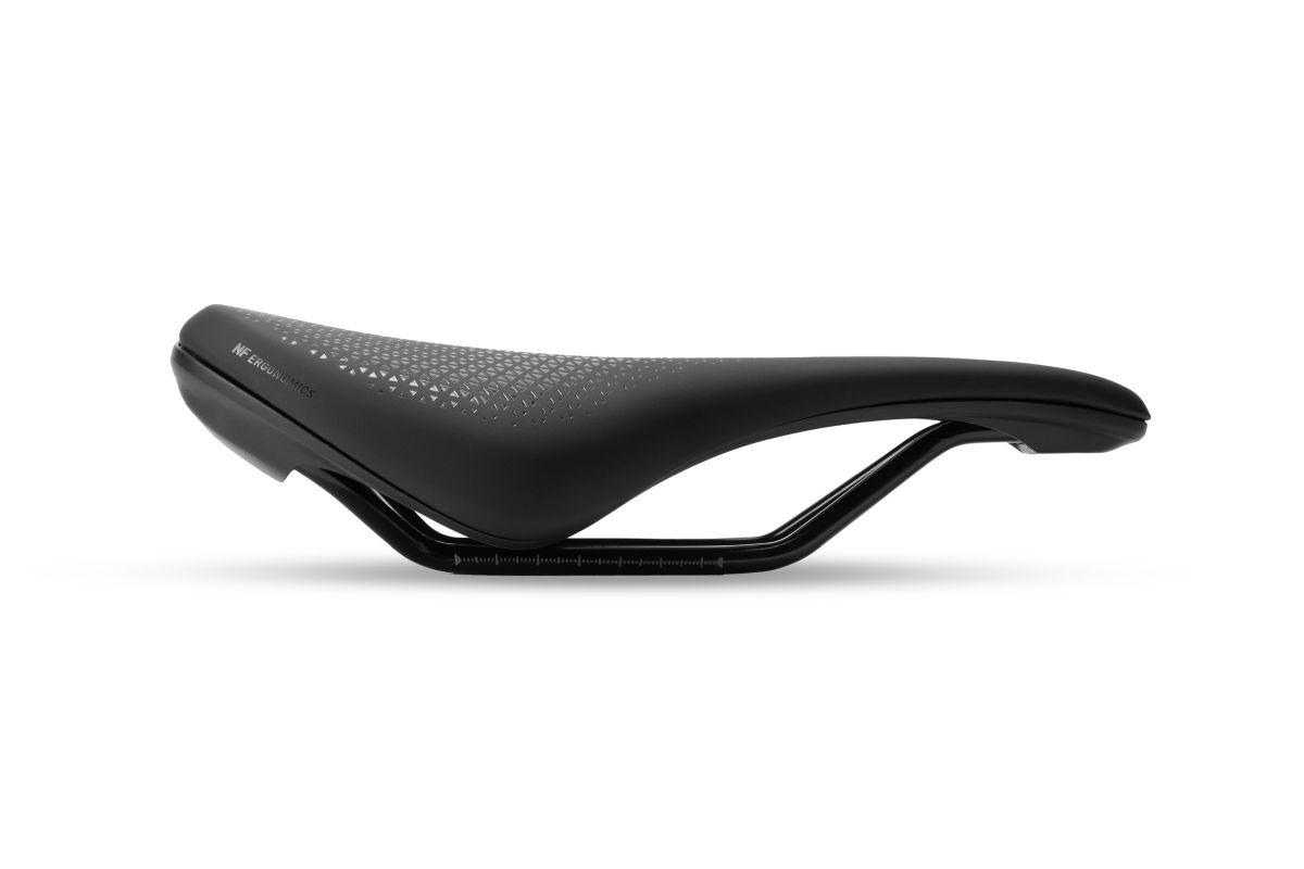 auf die männliche Anatomie abgestimmter NF Ergonomics Ergo-Relief-Channel mit Aussparung, T-shape für mehr Bewegungsfreiheit, Druckentlastung durch Deep-Shell-Technologie, Dual-Schaum Polsterung, Shock-Absorber Gestellaufnahme, hochwertiges PU Obermaterial, integrierte Satteladapteraufnahme (SILink), optimiert für Sitzposition Bent Forward (Saddle Finder B2)