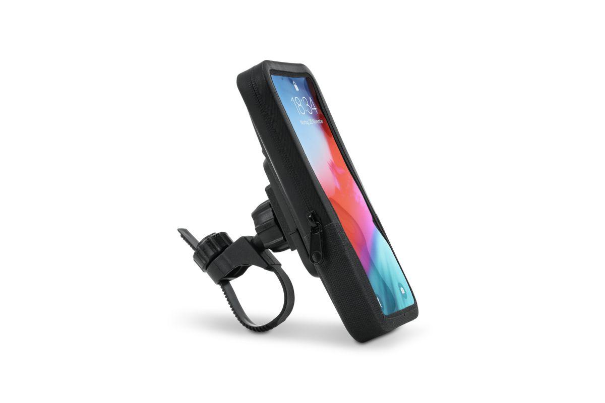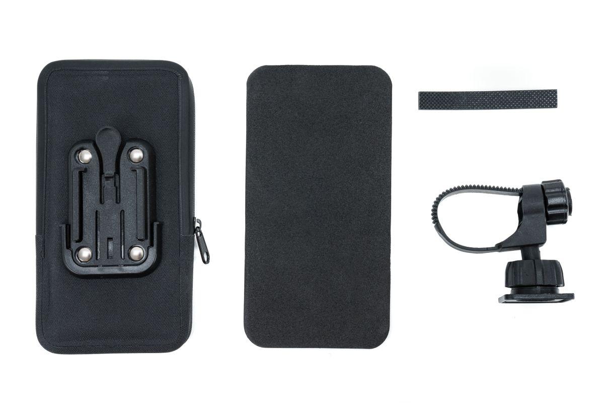 Adapter mit Kugelgelenk für individuelle Winkeleinstellung, verstärkte Rückwand für mehr Stabilität, einfache, werkzeuglose De-/Montage, sensible Touchscreen-Folie, beschichteter Reissverschluss, wasserfest, geeignet für Handys mit einer Maximalgröße von 15 x 8 cm