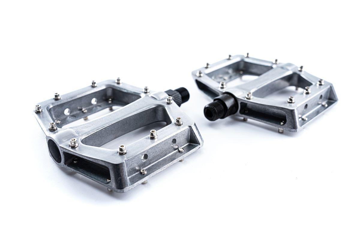 Die leichten Flat-Pedale sind aus Aluminium hergestellt und werden mit einer CrMo-Achse verbaut. Die Anti-Rutsch-Pins sind austauschbar und bieten besten Halt am Fahrrad.
