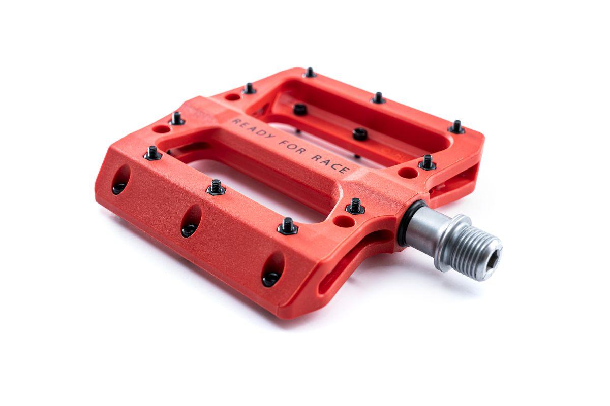 Ultraleichtes Flat-Pedal aus technischem Thermoplast. Mit Industrielager, austauschbaren Anti-Rutsch-Pins und CrMo-Achse.
