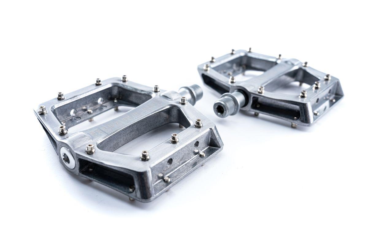 Die leichten Flat-Pedale sind aus Aluminium hergestellt und werden mit einer CrMo-Achse verbaut. Die Pedale werden mit hochwertigen Lagern gelagert. Die Anti-Rutsch-Pins sind austauschbar und bieten besten Halt am Fahrrad.